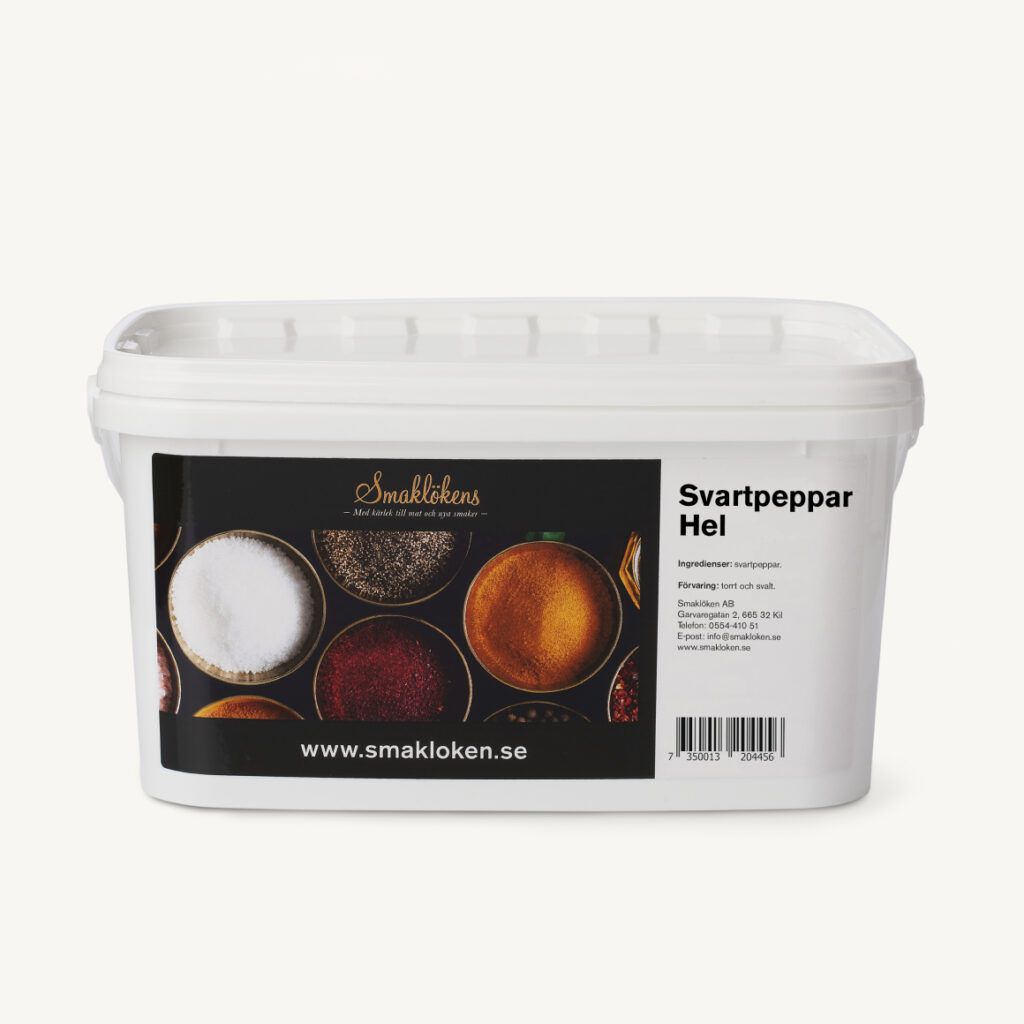 Smaklökens Svartpeppar Hel har en frisk, kryddig smak med behaglig hetta. Denna krydda är ett kärt inslag inte bara i vårt kök utan i de allra flestas och funkar även som bordskrydda. Passar all slags matlagning, såsom lamm, fläsk, fisk, fågel, såser och grönsaker. Få ut så mycket som möjligt av smaken genom att mala pepparkornen i en kvarn.